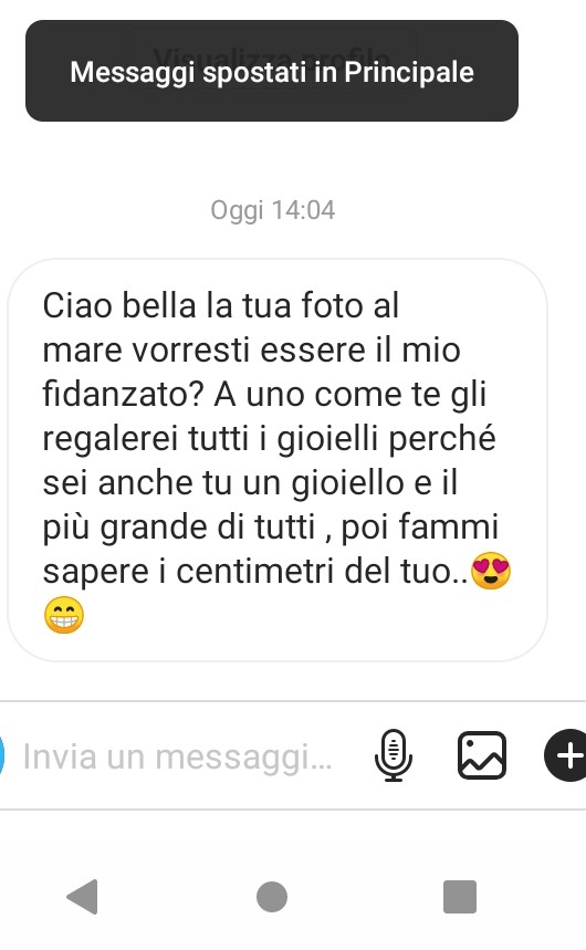 Questi messaggi che mi arrivano ( almeno due-tre al giorno, sono dovuti al fatto che si è sparsa la voce della mia superdotazione, e quindi mi ritrovo naturalmente commenti memorabili divertenti di persone che vogliono un pene enorme, cosa che mi capita spesso anche quando commento degli stati divertenti whatsapp, e mi ritrovo con immagini del sedere di chi ha visto il mio commento 😀